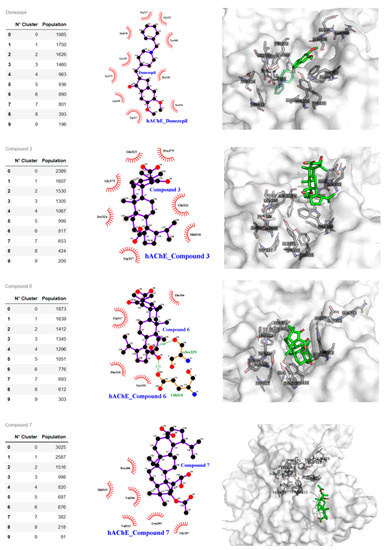 Compound binding cluster analysis from MDS and atomic interactions details. Left panel. Clustering from MDS of the AchE structures and frames population. The centroid of the most populated frame is analyzed with Ligplot and Pymol software. Central panel shows the compound and human AChE interaction at atomic level for Donepezil, compounds 3, 6, and 7. Right panel: 3-D compounds and human AchE interaction; the PAS pocket residues are shown with sticks and labels, the surface is white and transparent, the compounds are with green sticks, and oxygen atoms are in red.