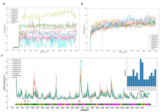 Molecular dynamics simulation (MDS) of compound and human AchE. (A,B). RMSD of compounds (A) and human AChEs (B) from MDS trajectory. RMSD for each compound assay with the line after 20 ns of equilibration with restraints; 20 ns after release the restrictions, the last 180 ns were used to RMSF calculations. (C). Human AChEs RMSF from MDS trajectory. These RMSF plots contain the low bar with the secondary structure f AChE, coil (green), sheet (yellow), and helix (magenta); the red line shows the more populated residues from the cluster analysis for each MDS and the compounds’ interaction.