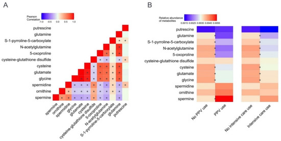 Figure 2. Correlations between nasopharyngeal glutathione-related metabolites and associations of glutathione-related metabolites with severity outcomes in infants hospitalized for bronchiolitis. (A). The heatmap shows the correlation between 12 measured nasopharyngeal glutathione-related metabolites. Glutathione substrates (i.e., cysteine, glycine, and glutamate) were positively correlated with each other. In contrast, these metabolites were negatively correlated with oxidized glutathione state (cysteine-glutathione disulfide). * p-value < 0.05 that is estimated by Pearson correlation coefficient. (B). The heatmap shows the association of nasopharyngeal glutathione-related metabolites with each of the two clinical outcomes. The relative abundance of glutathione substrates (i.e., cysteine, glycine, and glutamate) was lower in the PPV use group and the intensive care use group compared to their reference groups, suggesting their depletion. In contrast, the relative abundance of metabolites that bind glutathione (e.g., spermine) was higher in the PPV use group. The association of each metabolite with each outcome is shown in Figure 3. * FDR < 0.05 estimated by unadjusted logistic regression models. Abbreviations: FDR, false discovery rate; PPV, positive pressure ventilation.