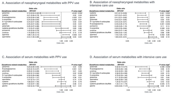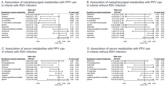To investigate the associations of nasopharyngeal and serum glutathione-related metabolites with the clinical outcomes of interest, unadjusted and multivariable logistic regression models were fit. Of the nasopharyngeal glutathione-related metabolites, the relative abundances of cysteine, glycine, and glutamate were significantly lower in both the PPV use and intensive care use groups, compared to the reference groups (all false discovery rates (FDRs) < 0.05; Figure 2B). In contrast, the relative abundance of spermine, which binds glutathione, was significantly higher in the PPV use group (FDR < 0.05). In the multivariable models, the lower relative abundances of seven nasopharyngeal metabolites, e.g., cysteine (adjOR 0.21, 95%CI 0.06–0.76), glycine (adjOR 0.25, 95%CI 0.07–0.85), and glutamate (adjOR 0.25, 95%CI 0.07–0.88), were significantly associated with PPV use (FDR < 0.05; Figure 3A). In the stratified analysis by RSV infection, the direction of the association was consistent with wider 95%CIs in the setting of the limited statistical power (Figure 4).