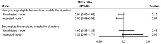 Nasopharyngeal and serum PPV-related glutathione-related metabolite signatures were computed by using the generalized additive model. The predictive ability of the nasopharyngeal signature was an area under the receiver-operating-characteristics curve (AUC) of 0.82 (95%CI 0.76–0.88; Figure S3A); that of the serum signature was 0.88 (95%CI 0.81–0.95; Figure S3B). In the multivariable logistic regression model, the nasopharyngeal signature was negatively associated with the risk of asthma development (adjOR 0.90, 95%CI 0.82–0.99, p-value = 0.04; Figure 6).
