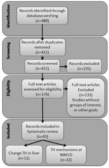 Our search initially identified 480 titles and abstracts of potentially eligible studies through database searching. After duplicate removal, 411 records were screened, and 176 full texts were assessed for eligibility. Of these, 133 did not provide information about the outcome of interest. Forty-three studies were included in the analysis, eleven related to changes in serum levels of THs and the liver, and thirty-two evaluating alterations in the metabolism of THs in relation to the progression of MAFLD (Figure 1).