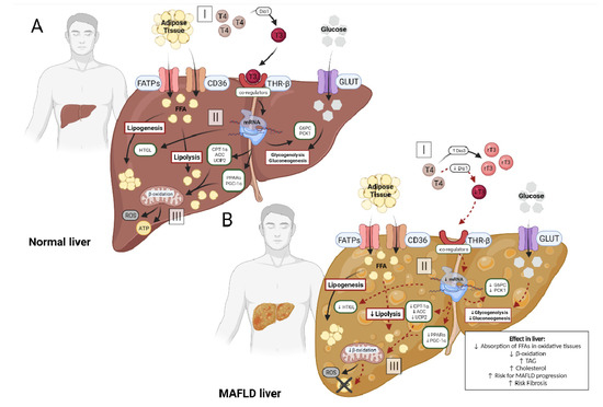 (A): In the normal liver, circulating adipose tissue enters the hepatocyte via specific receptors, FATPs and CD36 (A-I). At the same time, the circulating hormone T4 is converted into T3 by the enzyme Dio1, making it biologically active and enabling its binding to its THRβ receptor (A-I). This attachment generates the activation of co-regulators, which could stimulate the transcription of genes in the hepatocyte (A-II). The main genes activated in this process are CPT-1α, UCP2, PGC-1α and PPARs, increasing hepatic lipolysis and β-oxidation, and ATP production (A-III). Other genes that are indirectly stimulated are HTLG linked to the process of lipogenesis and genes linked to glycogenolysis and gluconeogenesis, G6PC and PCK-1, using the serum glucose that entered the hepatocyte via the specific transporter GLUT (A-II). (B): In the MAFLD liver, the process is changed. Circulating adipose tissue enters the hepatocyte via FATPs and CD36 (B-I). However, circulating T4 does not convert into T3, but into rT3 or T2, due to the reduction of Dio1 activity and the increase of Dio3, decreasing the binding of the hormone to the THRβ (B-I) receptor. With lower availability of T3, the activation of co-regulators does not occur effectively, reducing the transcription of genes in the hepatocyte (B-II). Among the affected genes are CPT-1α, UCP2, PGC-1α and PPARs, decreasing hepatic lipolysis and β-oxidation, reducing ATP production and increasing reactive oxygen species (ROS) (B-III). Other genes also affected alter the process of lipogenesis and decrease glycogenolysis and gluconeogenesis (B-II). This imbalance of hepatic metabolism is one of the main factors involved in the progression of MAFLD, with a high risk of fibrosis.