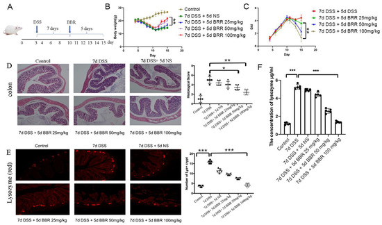 3.1. Berberine Ameliorates DSS-Induced Ulcerative Colitis and Inhibits the Expression and Secretion of Lysozyme