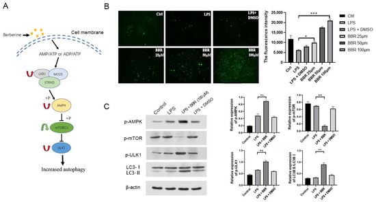 3.3. Berberine Promotes Autophagy through the AMPK/MTOR/ULK1 Pathway