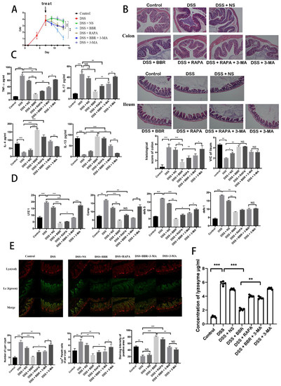 3.4. Berberine Alleviates DSS-Induced Ulcerative Colitis and Inhibits the Expression and Secretion of Lysozyme via Promoting Autophagy