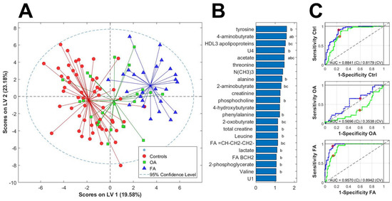 (A) Scores plot of the PLS-DA analysis of the metabolome, adjusted by age, BMI and BMD for the discrimination between Ctrl group (red circles), OA (green squares) and Frac (blue triangles). (B) Metabolites with PLS-DA VIP score higher than 1 for the same PLS-DA model of the metabolome. a: OA vs. Ctrl group; b: Frac vs. Ctrl group; c: Frac vs. OA group. (C) Receiver-operating curve (ROC) analysis for the classification of each individual group (from top to bottom; Ctrl group, OA group and Frac group based on our PLS-DA model.