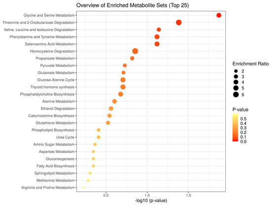 The metabolite set enrichment analysis of our metabolites with PLS-DA scores higher than 1 and p-values < 0.05 after the analysis with MetaboAnalyst. Metabolic pathways whose name is indicated are significant (p-value lower than 0.05 after the adjustment using Holm-Bonferroni method and False Discovery Rate) and have a pathway impact value calculated from pathway topology analysis over 0. The pathways are represented as circles. The circle color indicates the significance level from highest (red) to lowest (white) in the enrichment analysis. The circle size is proportional to the impact value of each road from the topology analysis.