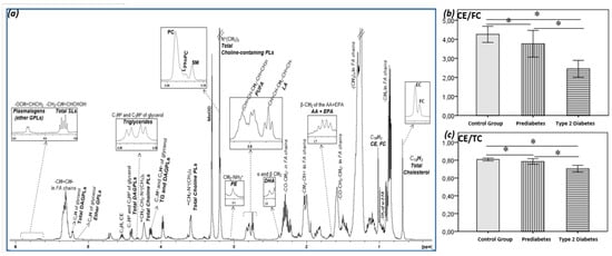 (a) 1H NMR spectrum of an HDL lipid extract. Figure adopted from [], (b) Cholesterol esters to free cholesterol (CE/FC) ratio in the study groups (mean ± SD), (c) cholesterol esters to total cholesterol ratio (CE/TC) in the study groups (mean ± SD). * Statistically significant (p < 0.001).