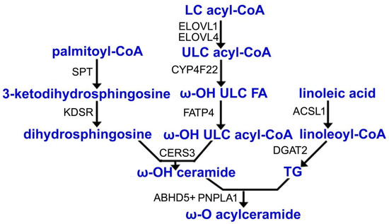 As with all ceramides’ biosynthetic pathways, the de novo biosynthesis of acylceramide was initiated by serine palmitoyltransferase (SPT), which condensed serine with palmitoyl-CoA to produce 3-ketodihydrosphingosine [12]. The 3-ketodihydrosphingosine was then reduced to dihydrosphingosine, catalyzed by 3-ketodihydrosphingosine reductase (KDSR) [13]. Fatty acid elongase ELOVL1 extended long-chain (LC) acyl-CoA to C26, which was further elongated to C30-C36 ultra-long-chain (ULC) acyl-CoA by ELOVL4 [14,15]. Ultra-long-chain fatty acids (ULCFAs) are unique to acylceramides. After removing CoAs from ULC acyl-CoA, ULCFAs were ω-hydroxylated by the action of CYP4F22, a member of the cytochrome P450 family, to produce ω-OH ULCFAs [16,17]. Next, ω-OH ULCFAs were converted to ω-OH ULC acyl-CoAs by fatty acid transporter protein 4 (FATP4) as an acyl-CoA synthetase [18,19]. The de novo synthesis of dihydrosphingosine as the primary long-chain base (LCB) donor and ω-OH ULC acyl-CoAs as the fatty acyl donor were incorporated by ceramide synthase CERS3 for ω-OH ceramide synthesis [20].