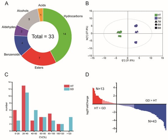 Statistical analysis of volatiles. (A) Metabolite classes of the volatiles detected in HS-SPME/GCMS analysis. (B) OPLS-DA scores plot analysis of detected volatiles between different varieties of coconut over three growth stages. (C) Coefficient of variation (CV) analysis redundant of the metabolome during flesh growth of HT and GD. (D) The distribution of the fold change between HT and GD. The metabolites are ordered based on their fold change between HT and GD.