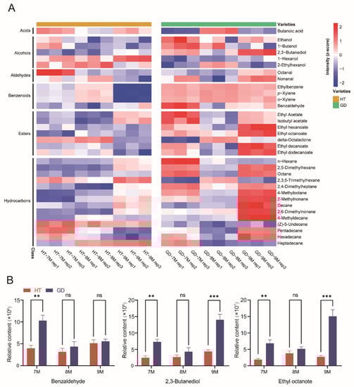 Analysis of coconut flesh volatile accumulation patterns between two coconut varieties over three growth stages. (A) The levels of volatile of coconut flesh in two coconut varieties over three growth stages are shown in the heatmaps. Volatiles were arranged by metabolite classes. (B) Comparative analysis of volatiles in the flesh of two coconut varieties at three different growth stages. Student’s t test was performed (ns: not significant, ** p < 0.01, *** p < 0.001).