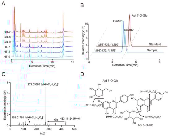 Detection and identification of secondary metabolites by UHPLC–HRMS. (A) TIC (total ion chromatogram) of metabolites in different varieties and stages of coconut flesh obtained from UHPLC–MS/MS analysis. (B) EIC (extracted ion chromatogram) of apigenin 5-O-glucoside and apigenin 7-O-glucoside detected at 4.28 min and 4.35 min in sample. Apigenin 7-O-glucoside detected at 4.35 min in standard. (C) MS/MS spectra at m/z 433.11124, and the metabolite was identified as apigenin 7-O-glucoside. (D) The molecular structure of the apigenin 7-O-glucoside and apigenin 5-O-glucoside and their general fragmentation rules.