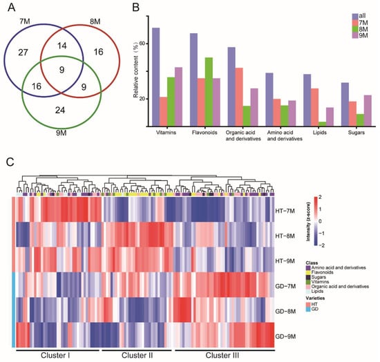 Differential accumulation metabolite analysis. (A) Venn diagram shows the number of differentially accumulated metabolites among three growth stages. (B) Statistical analysis of differentially accumulated metabolites in different metabolite classes. (C) The levels of nonvolatile of coconut flesh in two coconut varieties over three growth stages are shown the heatmaps. Hierarchical cluster analysis of differentially accumulated metabolites. Each column in the figure represents a metabolite, each row represents either GD or HT coconut varieties at three different growth stages.