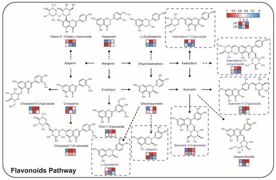 Flavonoids are most abundant in HT, so the flavonoid biosynthesis pathway may account for the bitter taste of HT flesh (Figure 4C). A pathway including 15 flavonoids was constructed, including flavonols, flavonoids, flavanones and catechins (Figure 5). Seven glycosylated flavonols accumulated in HT at multiple growth stages. One of these glycosylated flavonols, kaempferol 7-O-glucoside, that was determined to be the key bitter and astringent tasting compound in the tea plant, was over four times more abundant at the 9M growth stage compared to the 7M growth stage in HT. Other precursors and products of flavonoids displayed the same accumulation pattern, including (−)-epiafzelechin and vitexin 2″-O-beta-L-rhamnoside. Among them, catechin and L-epicatechin are both bitter and astringent compounds, and accumulate in HT compared to GD. These flavonoid accumulation patterns indicate that the total accumulation of flavonols and their derivatives may be the main reason for the poor taste of HT.