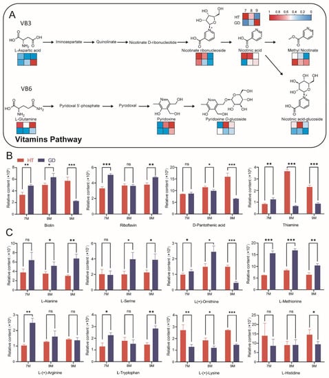 Comparative analysis of nutritional metabolites in the flesh of two coconut varieties across three growth stages. (A) Vitamin pathways in coconut flesh. The heatmaps are drawn according to the relative content of metabolites, and the contents of each metabolite were normalized. Columns and rows in the heatmap represent stages and varieties, respectively. In each heatmap, the upper row represents HT, the lower row represents GD. In the columns of each heatmap, 7M, 8M and 9M are represented from left to right. (B) Differences in vitamin levels between two coconut varieties across three growth stages. (C) Differences in amino acid levels between two coconut varieties across three growth stages. Student’s t test was performed (ns: not significant, * p < 0.05, ** p < 0.01, *** p < 0.001).