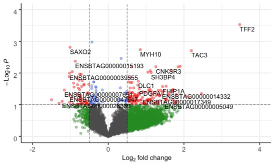 Figure 2. Volcano plot of gene-based differential expression analysis for AI-P (n = 6) and NP (n = 6) crossbred heifers. Each dot corresponds to a gene. The x-axis represents log2 fold change for the difference in expression in the AI-P and NP groups. The y-axis corresponds to the negative log (base 10) of the p-value. Grey dots represent nonsignificant genes that did not cross the threshold of p-value or fold-change; green dots represent the genes with absolute (log2 fold change ≥ 0.5); blue dots represent the genes with significant p-value; and red dots represent 38 DEGs (p-value ≤ 0.05 and absolute (log2 fold change ≥ 0.5)). The genes on the left panel (0 to −2 of log2 fold change) were downregulated, while the genes on the right panel (0 to 4 of log2 fold change) were upregulated.