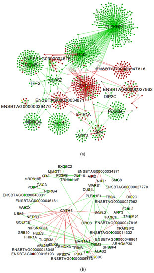 Figure 3. Network comparison based on rewired nodes (genes) of AI-P and NP networks. Central reference network constructed using DyNet in Cytoscape. (a) The network comprises 1095 nodes and 1164 edges. The hub targets connected to the network are represented in this network. (b) The network was filtered for betweenness centrality to display the hub genes from both groups. The unique nodes are red (AI-P) or green (NP). Shared nodes between AI-P and NP are yellow.