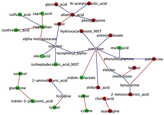 Figure 4. Metabolite network comparison based on rewired nodes (metabolites) from the AI-P and NP groups. A central reference network was constructed using DyNet in Cytoscape. The unique nodes are red (AI-P) or green (NP). Shared nodes between AI-P and NP are white. The edges are red (negative correlation) and blue (positive correlation).