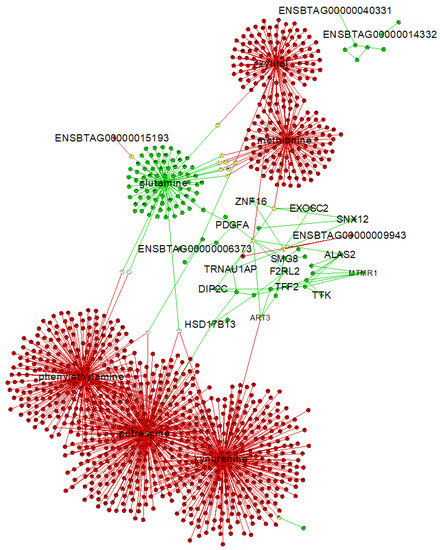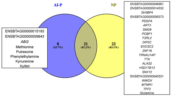 Lastly, we overlapped the results from the PCIT and IntLIM to explore those gene–metabolite pairs that were identified in both approaches. These pairs included tocopherol-α, which was positively correlated in the AI-P group with ENSBTAG00000009943 and negatively correlated in the NP group with EXOSC2, TRNAUIAP and SNX12. In the NP group, the α-ketoglutarate-SMG8 and putrescine-HSD17B13 pairs were positively correlated, whereas α-ketoglutarate-ALAS2 and tryptophan-MTMR1 were negatively correlated.