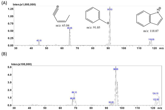 MS/MS product ion spectra of indole (A) in positive APCI mode [M + H], shows prominent fragments peak at m/z 91.1, 65.05, and 45.10 at CE-30 units and IS (B) shows prominent fragments peak at m/z 96.05 at CE-30 units.
