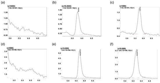 Representative MRM ion-chromatograms of (a) blank mouse serum using the conditions for indole detection, (b) indole spiked in mouse serum at 10 ng/mL (retention time, rt. 5.8 min), (c) indole mouse study serum sample (rt. 5.8 min, Id: AI-1_9-17-20), (d) blank mouse serum using the conditions for indole-d7 (IS) detection, (e) indole-d7 spiked in mouse serum (rt. 5.8 min, 200 ng/mL) and (f) indole-d7 spiked in mouse study serum sample (Id: AI-1_9-17-20).