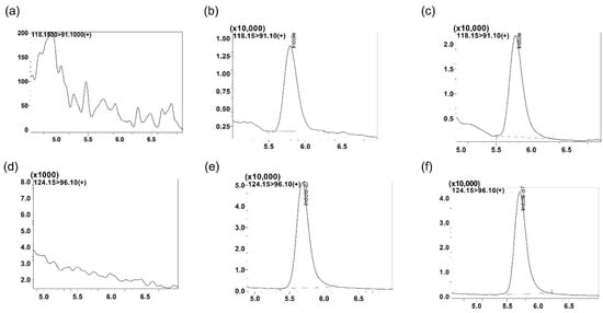 Representative MRM ion-chromatograms of (a) blank mouse lung homogenate using the conditions for indole detection, (b) indole spiked in mouse serum at 10 ng/mL (rt. 5.8 min), (c) indole mouse lungs homogenate study sample (rt. 5.8 min, Id: AI-2), (d) blank mouse lung homogenate using the conditions for indole-d7 detection, (e) indole-d7 spiked in mouse lung homogenate (rt. 5.8 min, 200 ng/mL) and (f) indole-d7 spiked in mouse study lung homogenate sample (Id: AI-2).