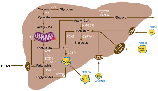 The synergistic actions of the transcription factors Sterol Regulatory Element-Binding Protein-1c (SREBP-1c) and Carbohydrate-Responsive Element-Binding Protein (ChREBP) coordinately activate the enzymatic machinery necessary for the conversion of excess glucose to FAs. SREBP-1c is the most relevant member of the family of the three transcription factors, namely SREBP-1a, SREBP-1c, and SREBP-2, in the liver [17]. All SREBPs act by translocation to the nucleus and binding to the target gene promoters. ACC, FAS, SCD1, Glycerol-3-Phosphate Acyltransferase (GPAT), and Spot14 are controlled by SREBP-1c for lipogenesis. The main regulated proteins by SREBP-2 for cholesterol biosynthesis are β-Hydroxy-β-Methylglutaryl-CoA Synthase (HMGCS), β-Hydroxy-β-Methylglutaryl-CoA Reductase (HMGCR), Farnesyl Pyrophosphate Synthetase (FPPS), squalene synthase and Low-Density Lipoprotein (LDL) Receptor (LDLR). Acetyl-CoA is the smallest building block for de novo synthesis of cholesterol, which is regulated by HMGCR. Cholesterol and TGs, however, may also be taken up from the plasma as lipoproteins. The relative amount of protein, phospholipids, cholesterol and cholesterol esters and TGs varies between the lipoproteins [18]. VLDL have 60% TGs, 20% cholesterol + cholesterol esters, 15% phospholipids and 5% protein compared with 8% TGs, 50% cholesterol + cholesterol esters, 22% phospholipids and 20% protein in LDL and 5% TGs, 25% cholesterol + cholesterol esters, 30% phospholipids and 40% protein in High-Density Lipoprotein (HDL). There are also chylomicron remnants, which are taken up by the liver, consisting mainly of TGs and a variable amount of cholesterol and cholesterol esters [19]. VLDL and LDL are coated with Apolipoprotein (Apo)100, chylomicron remnants with ApoB48 and HDL with ApoA1 (Figure 1).