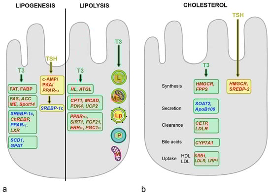 Influence of TH on lipid and cholesterol metabolism. (a): T3 stimulates lipogenesis by increase of Fatty Acid Translocase (FAT), Fatty Acid Binding Protein (FABP), upregulation of Fatty Acid Synthase (FAS), Acetyl-CoA Carboxylase (ACC), Malic Enzyme (ME), Spot 14 homolog (Spot14), decrease of Sterol Regulatory Element-Binding Protein 1c (SREBP-1c) and Peroxisome Proliferator Activated Receptor (PPAR)-γ combined with increase of Carbohydrate-Responsive Element-Binding Protein (ChREBP) and Liver X Receptor (LXR) and decrease of Stearoyl-CoA Desaturase (SCD1) and Glycerol-3-Phosphate Acyltransferase (GPAT). TSH acts on lipogenesis through upregulation of c-AMP, Protein Kinase A (PKA) and PPAR-α, which cause activation of SREBP-1c. T3 stimulates lipolysis by upregulation of Hepatic Lipase (HL) and Adipose Triglyceride Lipase (ATGL). β-Oxidation is activated by increased expression of CPT1 and the mitochondrial enzymes, Medium-Chain Acyl-CoA Dehydrogenase (MCAD), Pyruvate Dehydrogenase Kinase isoform 4 (PDK4) and mitochondrial Uncoupling Protein 2 (UCP2). The CPT1 expression can also be stimulated via PPAR-α, Sirtuin 1 (SIRT1), Fibroblast Growth Factor 21 (FGF21), Estrogen-Related Receptor α (ERRα) and PPARγ-Coactivator 1α (PGC-1α), to increase uptake of Fatty Acids (FAs) in the mitochondria. Further, synthesis of mitochondria, mitophagy, lipophagy, degradation of lipids in lysosomes and enzyme activity of peroxisomes are induced by T3. Abbreviations: L, lysosome; Lp, lipophagy; M, mitochondrion; Mp, mitophagy; P, peroxisome. (b): Cholesterol synthesis is affected by T3 at the level of synthesis by induction of β-Hydroxy-β-Methylglutaryl-CoA Reductase (HMGCR) and Farnesyl Pyrophosphate Synthase (FPPS), secretion by downregulation of Sterol O-Acyltransferase 2 (SOAT2) and Apolipoprotein 100 (ApoB100), clearance by upregulation of Cholesteryl Ester Transfer Protein (CETP) and Low-Density Lipoprotein Receptor (LDLR), excretion by upregulation of CYP7A1 and uptake of HDL cholesterol by Scavenger Receptor Class B (SRB1) and of LDL cholesterol by LDLR and Low-Density Lipoprotein Receptor-related Protein (LRP1). Cholesterol levels are increased by TSH through upregulation of HMGCR and SREBP-2. Increased levels are indicated by red and decreases by blue color. Regulated genes are written in italics.