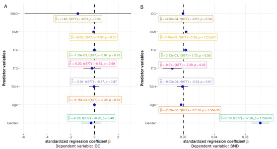 The first model with OC as a dependent variable showed no significant predictors (Figure 2A). In the second regression model with BMD as a dependent variable (Figure 2B), gender (coded as 0/1 for woman/man) and BMI were positively associated with BMD (both p < 0.001). Age (p < 0.001) and fT3 (p = 0.02) were negatively associated with BMD (Figure 2B).