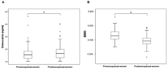 Box plots of (A) OC and (B) BMD levels in premenopausal and postmenopausal euthyroid women. * Denotes a significant p-value of a t-test at the significance level of 0.05. Outliers are marked with circles, while extreme outliers are marked with asterisks.