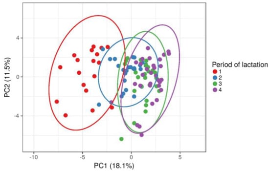 Principal components analysis (PCA) and clustering of cows based on lactation period (early—1, mid—2, full—3 and late—4) after including all blood and milk metabolic parameters.