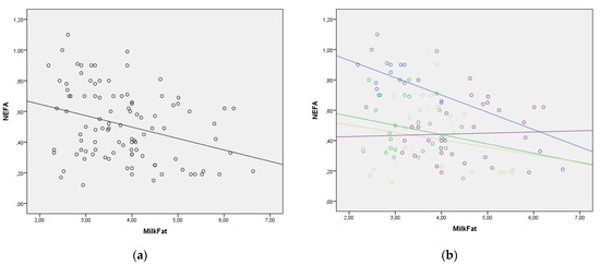 The regression lines for the statistically significant correlations between blood NEFA and BHB levels and selected milk parameters are presented in Figure 2. The regression lines for milk fat to blood BHB, milk fat to blood NEFA, and milk BHB to blood BHB relationships showed good homogeneity with the similar slopes through all four lactation periods. However, in other relationships, the regression lines changed their slope, indicating that lactation period should be taken into consideration when evaluating lipolysis and ketogenesis using milk parameters (Figure 2). The change in the value of NEFA and BHB in the function of enzymes in milk was much greater in the later periods of lactation. This requires additional research.