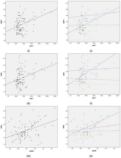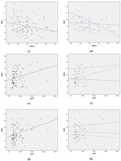 (a–n) Correlation between blood NEFA and BHB values and milk parameters with lactation period added as a covariate (lactation period and the color of both the line and the figures: early lactation-Group 1—blue; full lactation-Group 2—green; mid lactation-Group 3—golden; late lactation-Group 4—violet). (a) Correlation between milk fat and blood NEFA in whole lactation; (b) Correlation between milk fat and blood NEFA with lactation period as covariate; (c) Correlation between milk fat and blood BHB in whole lactation; (d) Correlation between milk fat and blood BHB with lactation period as covariate; (e) Correlation between milk AST (mAST) and blood NEFA in whole lactation; (f) Correlation between milk AST (mAST) and blood NEFA with lactation period as covariate; (g) Correlation between milk AST (mAST) and blood BHB in whole lactation; (h) Correlation between milk AST (mAST) and blood BHB with lactation period as covariate; (i) Correlation between milk ALT (mALT) and blood NEFA in whole lactation; (j) Correlation between milk ALT (mALT) and blood NEFA with lactation period as covariate; (k) Correlation between milk ALT (mALT) and blood BHB in whole lactation; (l) Correlation between milk ALT (mALT) and blood BHB with lactation period as covariate; (m) Correlation between milk BHB (mBHB) and blood BHB in whole lactation; (n) Correlation between milk BHB (mBHB) and blood BHB with lactation period as covariate.