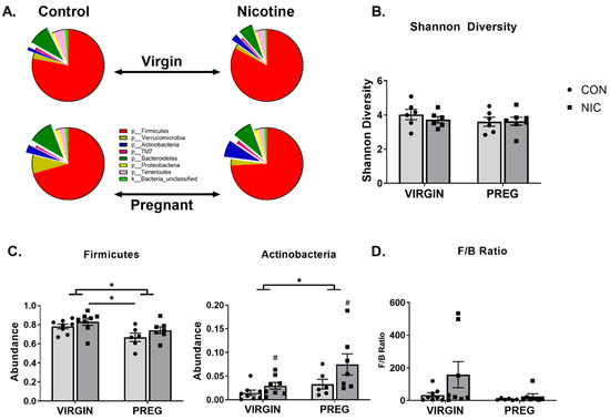In addition to the changes in individual phylum, as an indicator of overall gut microbiota health, the ratio of bacterial abundance in the p_Firmicutes versus p_Bacteriodetes was calculated. As shown in Figure 2D, the F/B ratio tended to be lower during pregnancy compared to the virgin state (p = 0.09; two-way ANOVA) and NIC appeared to generally increase the F/B ratio (p = 0.13), but these changes were not significant, likely due to high variability in the ratios.
