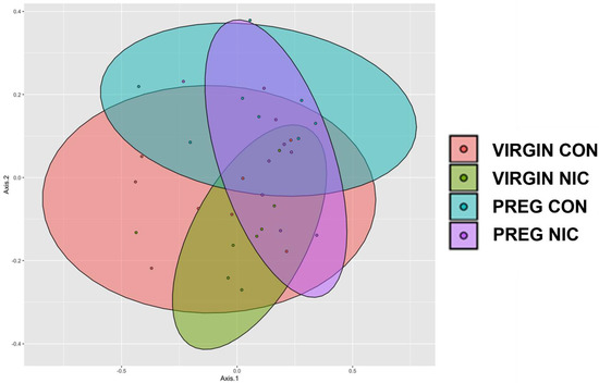The diversity between samples (Shannon beta diversity) was quantified using the Bray–Curtis dissimilarity method (Microbiome Insights; Bray and Curtis 1957, Figure 2B). Permutational analysis identified significant differences between the virgin and pregnant groups only (Figure 2A, p < 0.05). Although there was considerable overlap between all groups, there were distinct regions of non-overlap between the virgin NICs and pregnant CONs (olive vs. aqua colors, respectively, p = 0.054), virgin NICs and pregnant NICs (olive vs. purple colors, respectively, p = 0.054) and virgin CONs and pregnant NICs (orange vs. purple colors, respectively, p = 0.054). To display the differences between the groups, an unweighted principal coordinate analysis (PCoA) was also performed (Figure 3).