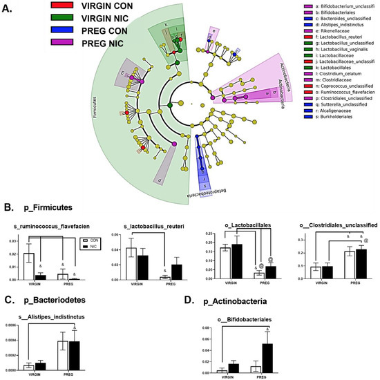 Nicotine exposure in rodent pregnancy induces selective changes in cecal bacterial abundance in Firmicutes, Bacteriodetes, and Actinobacteria phyla. (A) Taxonomic cladogram generated in Galaxy demonstrating shifts in taxonomic groups following nicotine exposure in the virgin versus pregnant rats (P). Each circle represents a bacterial taxon, with its diameter proportional to the taxon’s relative abundance. Yellow circles indicate no change. Colored circles indicate significant changes in abundance relative to other groups. Red—virgin controls; green—virgin nicotine exposed; blue—pregnant controls and purple—pregnant-nicotine exposed data. (B–D) Two-way ANOVA analysis with multiple comparisons was performed and revealed significant differences in order (o_) or species (s_) between groups in the phylum Firmicutes, Bacteriodetes and Actinobactera, as annotated. Values are mean ± SEM; & indicates p < 0.05 between CON in virgin and other groups as indicated; @ indicates p < 0.02 between virgin nicotine versus other groups indicated. n = 6–8 samples per group.