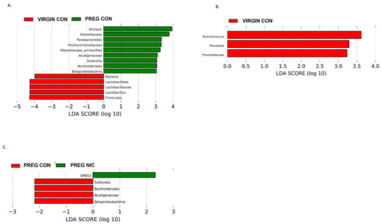 Effect of pregnancy and nicotine on cecal bacterial abundance and composition in female SD rats. LDA analysis of cecal bacterial taxa demonstrates significant shifts in taxonomic groups during pregnancy alone (in (A) red = virgin control; green = pregnant control), during s.c. exposure to nicotine in female SD rats (in (B) red = virgin control, green = virgin nicotine), and during pregnancy with exposure to s.c. nicotine (in (C) red = pregnant control, green = pregnant nicotine) in SD dams. Each color represents a more abundant bacterial taxon relative to the other group. A marked decrease in Proteobacteria and specifically Betaproteobacteria in the PREG NIC vs. PREG CON group is shown (in (C)), while an elevated abundance in Betaproteobacteria may be important in normal rodent pregnancy (in (A)). Data are based on 16s sequencing analysis, n = 6–8 per group.