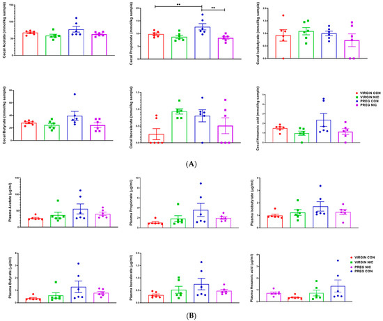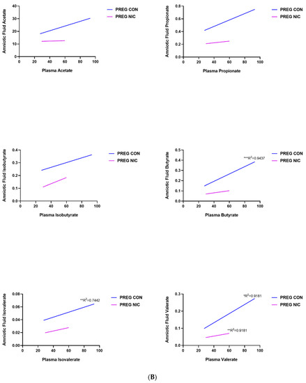 For SCFA extraction from serum and amniotic fluid, frozen samples were shipped overnight to Creative Proteomics (creative-proteomics.com, accessed on 25 June 2022, Shirley, NY, USA). As per the company’s methods, SCFA standards were dissolved in ethanol to generate standard concentration gradients from 0.001 mg/mL to 1000 mg/mL. Experimental samples were also resuspended in ethanol (containing 0.5% HCl, v/v) and centrifuged after ultrasonic treatment for 40 min. A volume of 1 µL was then injected through an Agilent DB-FFAP capillary column, fitted in an Agilent 7890–5977 gas chromatography–mass spectrometry system. Regression equations of the standards were used to calculate sample concentration. Data were averaged within each group and presented as mean ± SEM. In addition, linear regression analysis was performed in GraphPad Prizm v8.0 to determine correlation between levels of maternal cecal and plasma SCFAs, and maternal plasma and amniotic SCFAs separately. Slope r2 ≥ 0.70 with significance value of p < 0.05 was considered as an indicator of high correlation.