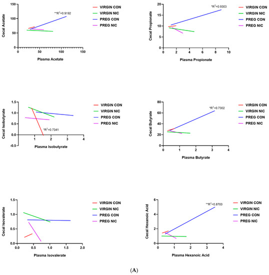 Relationship between cecal, plasma and amniotic fluid SCFAs in pregnant dams on nicotine. In (A), a positive correlation between cecal and circulating (plasma) acetate, propionate, butyrate and hexanoic acid was observed in pregnant control (PREG CON) dams alone. In (B), a positive correlation between circulating (plasma) and amniotic fluid levels of all measured SCFAs was observed in some samples from PREG CON dams. Linear regression analysis was performed, * p < 0.05, ** p < 0.01, *** p < 0.001 from zero; n = 8–10 samples per group.