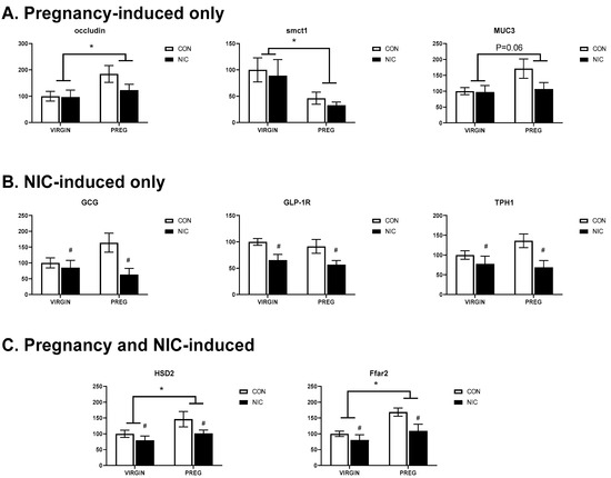 Figure 8B shows the expression of those genes that were primarily altered by NIC. Interestingly, in all three instances, NIC induced a downregulation of gene expression, including GCG or preproglucagon (p < 0.019; two-way ANOVA), GLP-1, a peptide hormone receptor in the gut that plays important roles in regulating appetite and blood sugar levels and has been linked to regulating both gut motility and inflammation (p < 0.003), and TPH1, the rate limiting enzyme involved in the production of serotonin by enterochromaffin cells in the gut and linked to the maintenance of gut health, appetite, absorption and inflammatory responses (p < 0.015). Finally, Figure 8C shows the three genes altered by both pregnancy and NIC. Included in this group was 11-beta-HSD2, which is involved in metabolizing glucocorticoids and was upregulated by pregnancy (p < 0.043; two-way ANOVA) but was downregulated by NIC (p < 0.05). The exact role of HSD2 in the gut is not understood, but may be linked to increased metabolism of cortisol, potentially modulating fetal exposure to stress hormones during pregnancy, similar to its role in the placenta. Ffar2, or free fatty acid receptor 2 (Gpr43), expression was also upregulated by pregnancy (p < 0.005) but downregulated by NIC (p < 0.0018). This pattern is similar to that observed for its primary ligands, the cecal SCFAs acetate and propionate. Additional genes were evaluated but did not show any change in pregnancy and/or NIC-included Tnf (p > 0.42), lactate transporter Slc16a1 (p > 0.08), Sert1 (p > 0.1), and Ffar3 (p > 0.38).