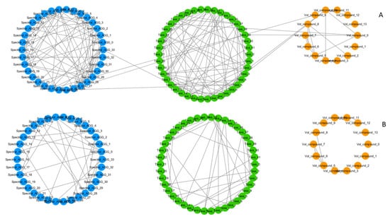 Correlation network of omics features generated for the same group (T0, males) at different correlation coefficient thresholds (t), with an attribute (feature)-grouped layout. (A) Softer correlation threshold, t = 0.5. High density of links in same feature-type groups and presence of inter-omics links (links connecting circular groups with different colours). (B) Harder correlation threshold, t = 0.6. Lower density of links in same feature-type groups, inter-omics links disappear. A more fragmented network of smaller but more strongly connected communities remains. Node colour represents different types of features. Blue: NMR spectral features, metabolome. Green: microbial species, microbiome. Orange: volatilome.