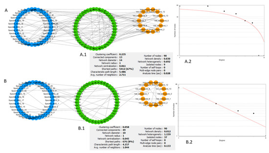 Comparison of network generated from different female diet groups at Te. (A) Network of omics interactions at Te for females that underwent the food product intervention. (A.1) List of general parameters of the network. (A.2) Best fit of the node-degree distribution. Axes are set to be logarithmic so that the fit of a distribution approximating a power law is a line. (B) Network of omics interactions at Te for females that underwent the placebo intervention. (B.1) List of general parameters of the network. (B.2) Best fit of the node-degree distribution. Axes are set to be logarithmic so that the fit of a distribution approximating a power law is a line. Comparing A.1 and B.1, we can see that network A is a denser network, with many interconnected neighbourhoods (avg. clustering coefficient) and lower number of isolated nodes. Its node-degree distribution (A.2) does not follow a power law and we cannot assume a scale-free structure and discuss its biological implications. Network B has a relatively high number of nodes with low degree (number of links) and a few nodes with very high degree (B.2). The node-degree distribution converges to a power law; the fit of the type y = axb returns R2 = 0.872. Node colour represents different types of features. Blue: NMR spectral features, metabolome. Green: microbial species, microbiome. Orange: volatilome.