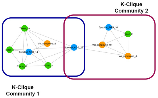 We can identify which well-connected subgraphs exist in the network at a given order k that serve as a sort of “zooming” parameter and speculate about which group-defining biochemical mechanisms we are observing in terms of metabolome, volatilome, and microbiome. Since nodes belonging to more than one community can be considered, by definition, important elements of the network, and each community is an ensemble of adjacent cliques, biochemical mechanisms underlying the interactions that constitute a community can be linked in a hierarchical way.