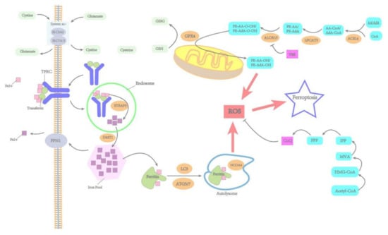 Ferroptosis is a unique kind of RCD involved in a variety of biological processes [4]. It is mainly regulated by the following mechanisms: iron metabolism pathways, lipid metabolism pathways, amino acid metabolism pathways, and so on. The occurrence of ferroptosis can be promoted by ROS generated by the Fenton reaction, polyunsaturated fatty acids (PUFAs), and lipid peroxidation, whereas system xc-/glutathione (GSH)/glutathione peroxidase 4 (GPX4) axis suppresses ferroptosis by affecting the redox state of cells [6]. Moreover, coenzyme Q (CoQ) in its reduced form can also inhibit ferroptosis by suppressing lipid peroxidation. In short, the key mechanism of ferroptosis lies in the accumulation of iron-dependent ROS, which leads to lipid peroxidation. The following Figure 1 is a detailed description of the processes.