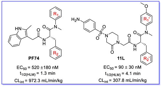 The chemical structures of PF74 and 11L [10]. EC50 is the concentration of the compound required to achieve 50% protection of TZM-bl cells against HIV-1-induced cytopathic effect, determined in at least triplicate against HIV-1 in TZM-bl cells; t1/2 is the half-life; and CLint is the intrinsic clearance.