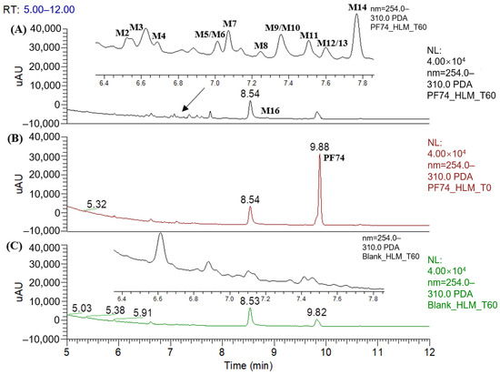 UPLC–UV (254–310 nm) chromategrams of PF74 in HLMs: (A) UPLC–UV spectrum of T60 (M1 and M15 are not listed due to weak UV absorption); (B) UPLC–UV spectrum of T0; (C) blank UPLC–UV spectrum.
