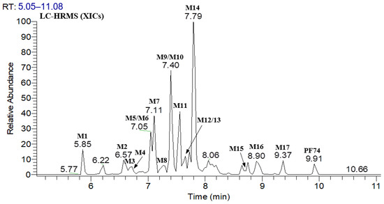 Figure 2 displays the UPLC–UV chromatogram of PF74 in HLMs at the detection wavelength of 254–310 nm, and Figure 3 displays the extracted ion chromatogram (XIC) of PF74 in HLMs. Metabolites were tentatively identified by comparing the UPLC–UV and UPLC–HRMS spectra and retention times of potential metabolites to the parent compound PF74. It is worth noting that after incubation at 37 °C for 60 min, PF74 was almost completely metabolized in HLMs. A total of 17 phase-I metabolites were discovered in the HLMs, and their spectra were compared to PF74 for structural confirmation (Figure 2 and Figure 3). According to the UV peak area, M7, M9, M11, and M14 were preliminarily identified as the main metabolites (Figure 2 and Table 1).