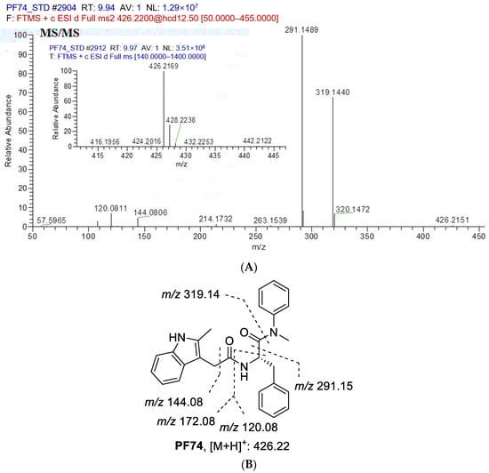 (A) Collision induced dissociation (CID) mass spectrometry of PF74; (B) Analysis of mass spectrometry fragments (m/z 426.2151). Here are major fragment ions (m/z 319.1440, 291.1489, 172.0762, 144.0806, 120.0811) of PF74 without metabolism.