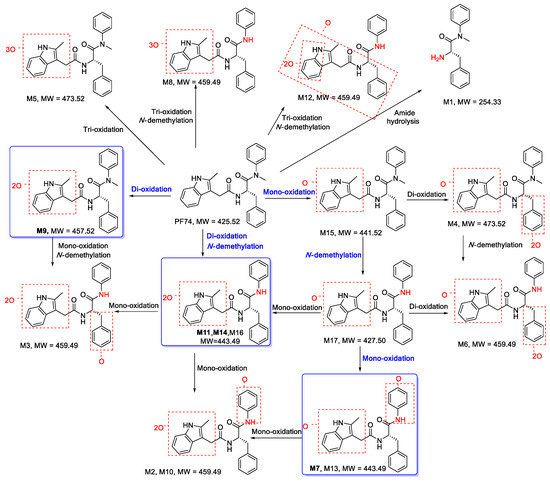 In this investigation, a total of 17 metabolites were found in HLMs of PF74. The proposed metabolic pathways of PF74 are exhibited in Figure 5. There was a series of metabolic reactions containing mono-oxidation, di-oxidation, tri-oxidation, mono-oxidation and demethylation, di-oxidation and demethylation, tri-oxidation and demethylation, amide hydrolysis, and so on. Metabolites M7, M11, M14 (di-oxidation and N-demethylation products), and M9 (di-oxidation product) were the four most abundant metabolites, so the main metabolic pathways of PF74 in HLMs were di-oxidation and N-demethylation, which also suggests that the indole ring, benzene ring R1, and N-methyl group were the main metabolic soft spots. In a previous study by Wang et al. [25], upon substituting the electron-rich indole ring of PF74 with a less electron-rich benzamide group, a preferred compound with similar submicromolar potency and much longer (51-fold) half-life was reported. Additionally, by replacing the benzene ring R1 with the electron-deficient benzothiazole moiety, we found a compound that exhibited markedly improved metabolic stability in HLMs, with a half-life 109-fold that of PF74 [26]. Furthermore, Sahani et al. [27] reported a PF74-like analog with 39 times enhanced metabolic stability over PF74, which led to increased resistance to N-methylation conceived via building the phenylalanine carboxamide into a pyridine ring. These results are consistent with our current findings, wherein we have identified the phase-I oxidative and N-demethylated metabolites as major metabolites of PF74 in HLMs.
